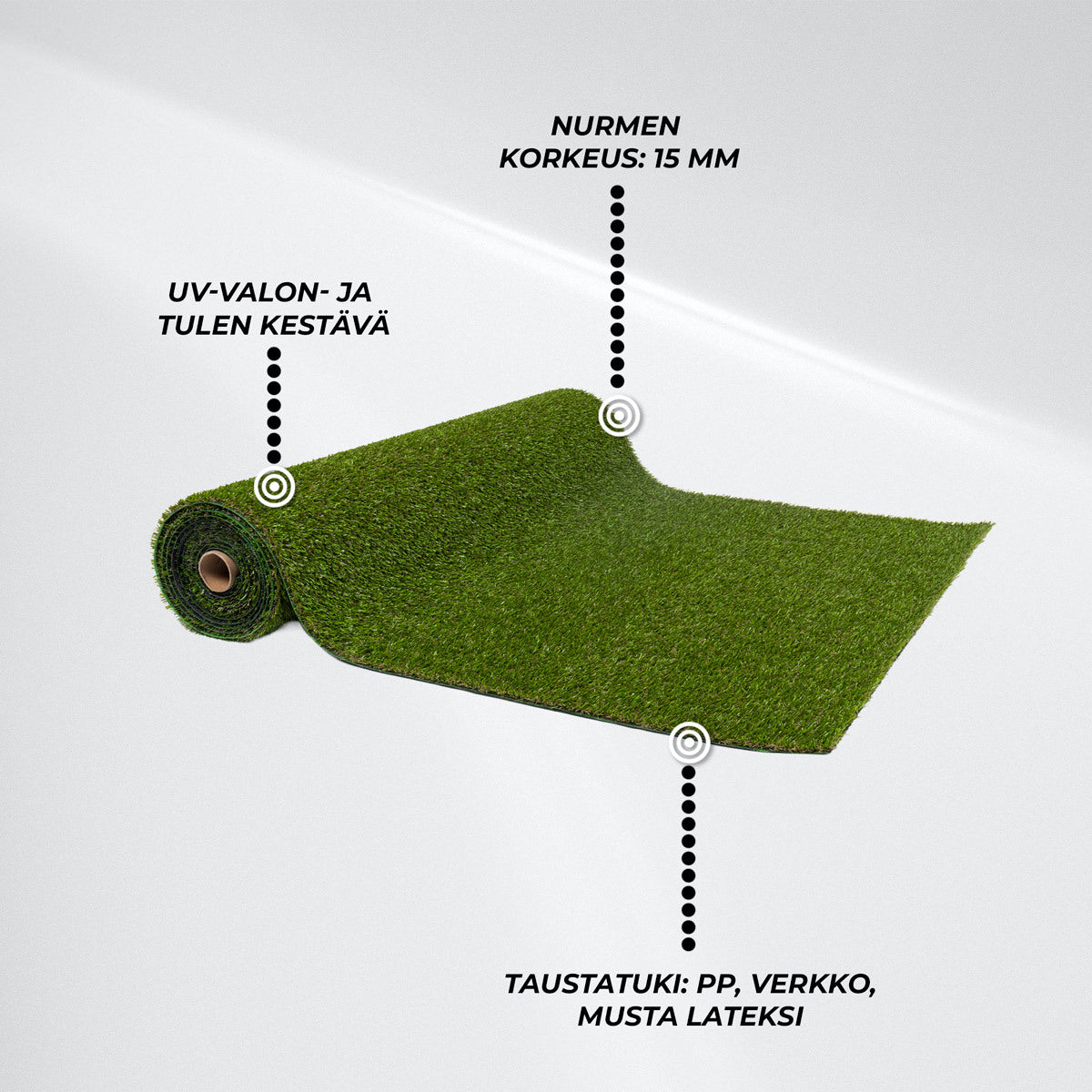 Fornorth Tekonurmi Original saapuu rullana ja avattuna se on 2 metriä leveä ja 10 metriä pitkä. Nurmen korkeus on 15 millimetriä ja se on valmistettu ympäristöystävällisistä materiaaleista, joiden taustatuki koostuu polypropeenista, verkosta ja mustasta lateksista. Nurmi on myös UV-valon- ja tulen kestävä, mikä tarkoittaa, että se säilyttää loisteliaan ulkonäkönsä vuosien ajan.