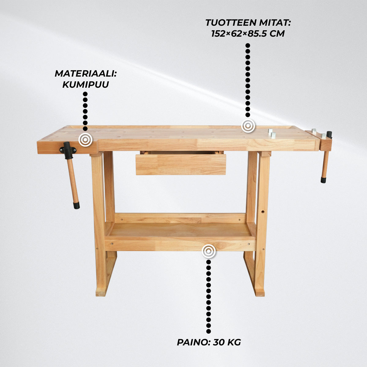 Lykke Höyläpenkki Original tarjoaa kestävän ja vakaan alustan puutöihin. Sen pitkäikäinen rakenne on valmistettu laadukkaasta kumipuusta, tarjoten luotettavan perustan vaativiinkin projekteihin. Työpöydän mitat, 152×62×85.5 cm, mahdollistavat sen helposti sijoitettavuuden niin kotona kuin harrastetiloissakin, minkä ansiosta voit työstää projektejasi missä vain ilman tilahuolia.
