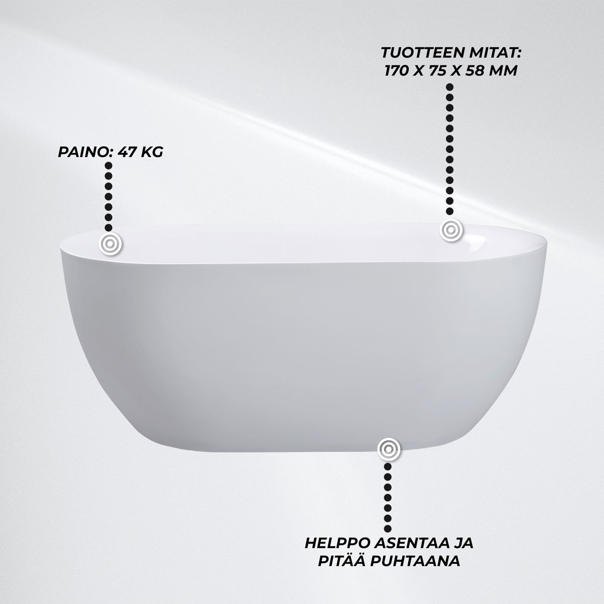 Vaikka Lykke Kylpyamme Arctic Deluxe on tilava, se on myös kevyt ja helppo asentaa. Sen paino on ainoastaan 47kg, mikä tekee siitä erinomaisen valinnan vapaasti seisovaksi kylpyammeeksi. Voit sijoittaa sen haluamaasi paikkaan kylpyhuoneessa ilman hankalia asennuksia.