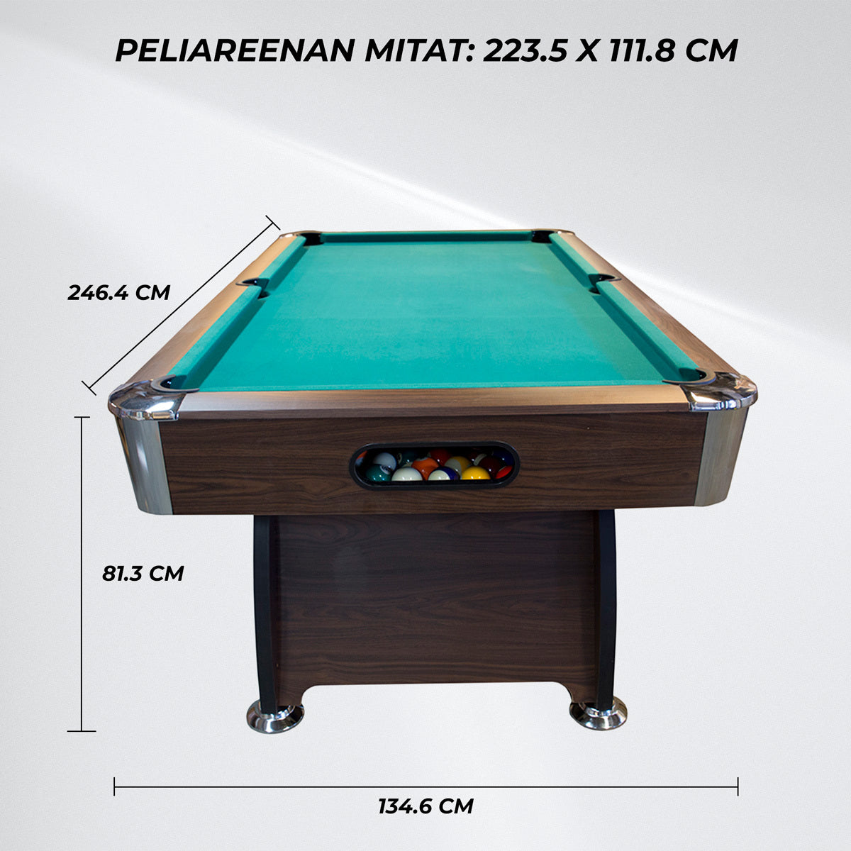 - Pelialueen mitat: 223.5 x 111.8 cm