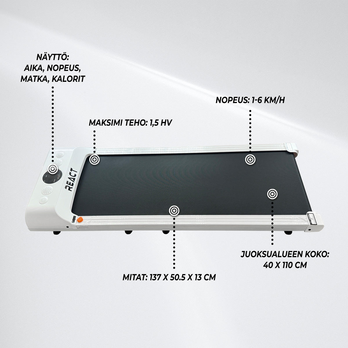 React Kävelymatto 1500 Valkoinen tarjoaa monia erityisiä etuja, jotka tekevät kävelystä nautinnollista ja tehokasta. Tämän kävelymaton 1.5 hv moottori takaa sujuvan ja häiriöttömän käyntikokemuksen kaikille käyttäjille. Maton nopeus on säädettävissä välillä 1 km/h - 6 km/h, mikä mahdollistaa harjoittelun personoinnin erilaisiin tarpeisiin soveltuvaksi.