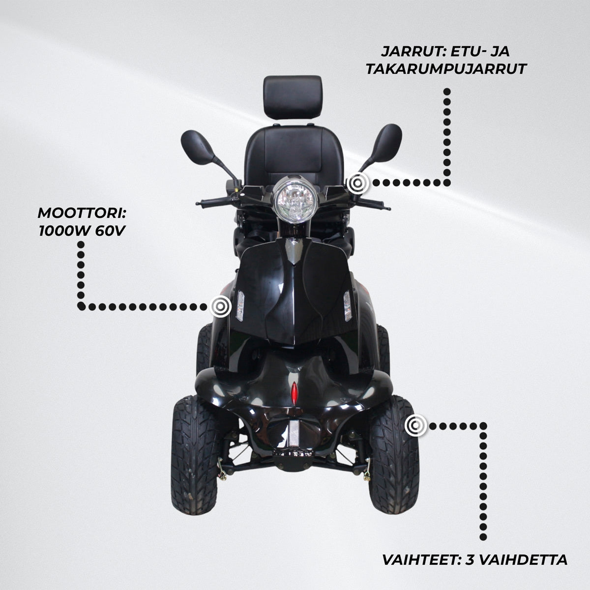 Koe vapauden tunne ja itsenäisyyttä lisäävä liikkuvuus Arvo Senioriskootteri P900 Mustan avulla. Tämä huipputeknologiaa hyödyntävä senioriskootteri on suunniteltu turvallisuutta ja mukavuutta ajatellen, tarjoten samalla poikkeuksellisen ajokokemuksen. Täydellinen ratkaisu niin kaupunkiympäristöön kuin golfkentillekin, P900 Musta vie sinut perille nopeasti ja tyylikkäästi. Sen tehokas 1000W moottori ja kolmivaihteinen vaihteisto varmistavat, että voit hallita nopeutta ja ajomukavuutta juuri sinulle sopivalla tavalla.