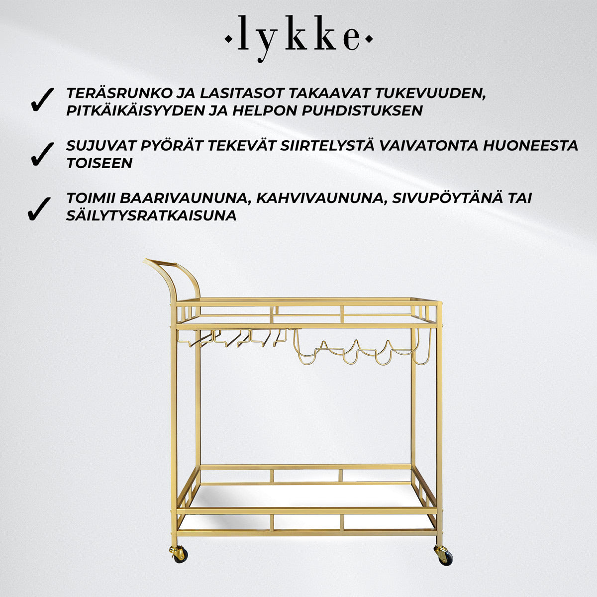 - Elegantti kultainen viimeistely: Kirkas kulta viimeistely tekee tästä baarikärrystä näyttävän keskipisteen missä tahansa huoneessa.