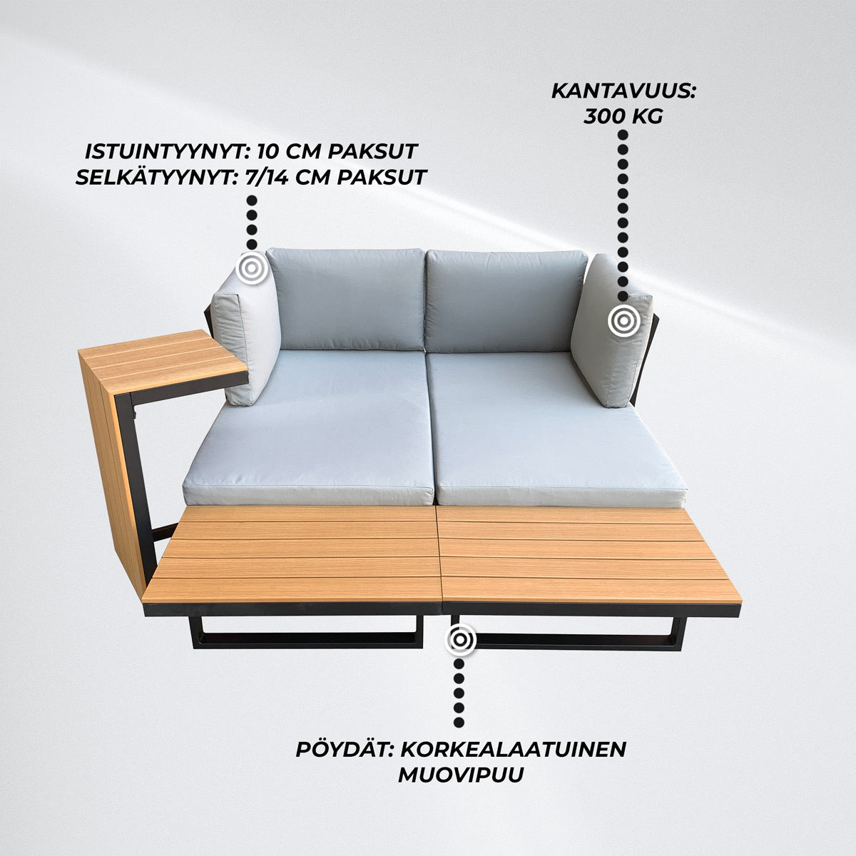 - Materiaalit: Alumiinirunko jauhemaalauksella, pöydät muovipuusta, istuintyynyt 10 cm paksuilla ja selkätyynyt 7/14 cm paksuilla.