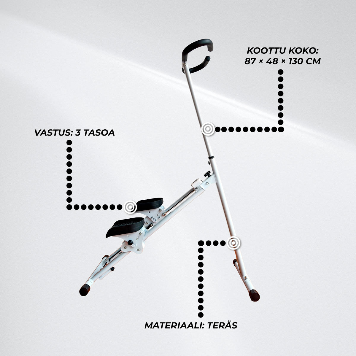 - Kätevästi säädettävä vastus: Kolme manuaalisesti säädettävää vastustasoa mahdollistavat harjoittelun henkilökohtaisten tarpeidesi mukaan.