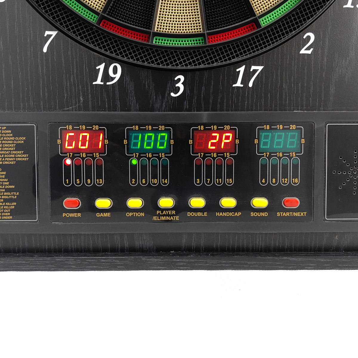 - Caratteristiche: Per 1-16 giocatori, 27 giochi e 243 variazioni, dimensione del bersaglio 40cm, display LCD, 6 freccette, 100 punte di ricambio morbide, Dimensioni del Cabinet: 52,5x69x7 cm, Materiale del Cabinet: MDF, Risparmio energetico automatico, Funzione memoria, Voce dell'annunciatore in inglese, Alimentazione a rete, Certificati: CE, ROHS, EMC, LVD